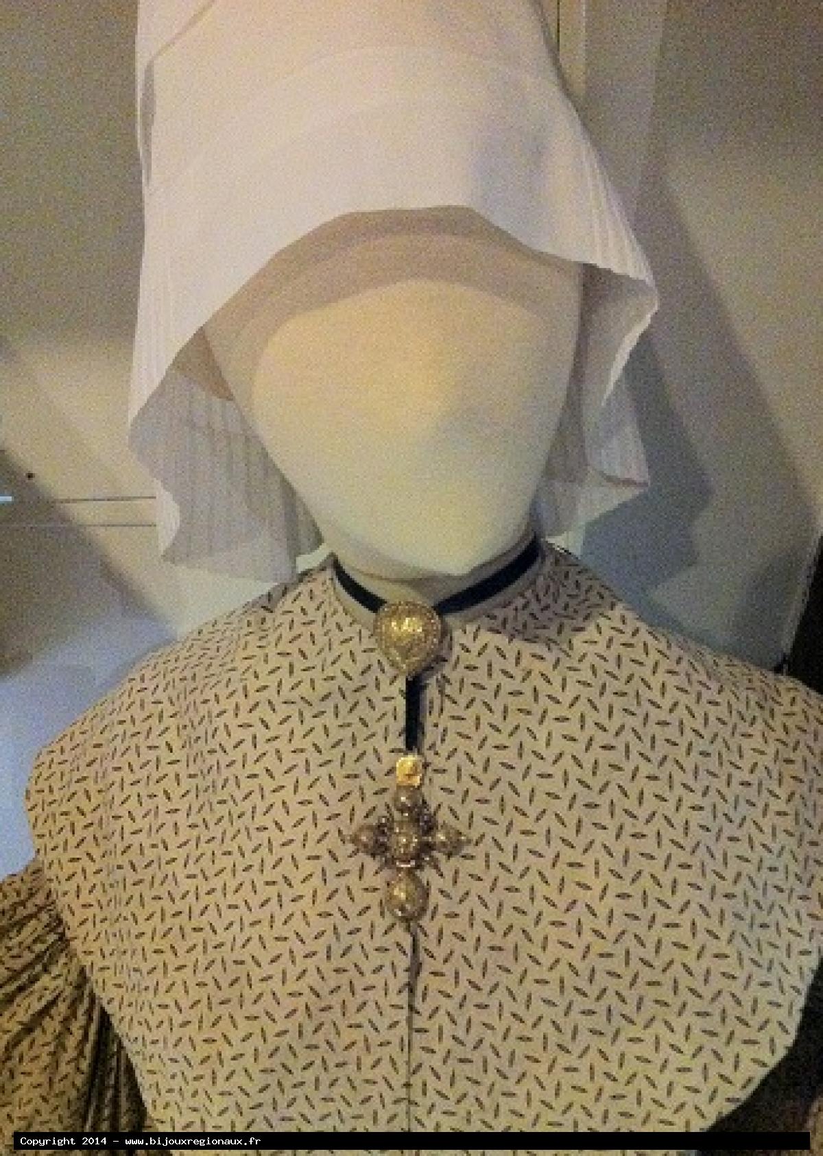 In 1801, Mr. Masson Saint-Amand, prefect (governor) of the department of the Eure, sent to the minister of the interior Jean-Antoine Chaptal, a report on the state of the department in order to demonstrate its progress since the revolution of 1789. "The older women wear quite simple coiffes, whereas the younger women, particularly those who frequent the markets in town, wear very high coiffes mounted like a graceful pyramid above the head, and from which flow long lengths of lace. Almost all, in winter, have capes with hoods in etamine or black camelot, generally lined with white espagnolette. One of their favourite adornements, which in the marriage contract figures alongside the wedding band, is a gold cross with a heart attached to a black velvet ribbon and worn around the neck. The crosses, which are very large in some counties, are raised in bumps or set with quartz stones which are found around Alençon." (1)