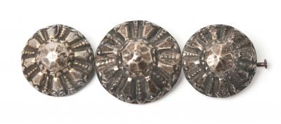 Cashing in on the craze for "peasant" jewels stimulated by the international exhibition in London in 1872, jewelery manufacturers surpassed themseves in inventiveness to release new models. The Victoria & Albert museum in London has a fine collection of European peasant jewellery bought during the international exhibitions. In the article by Jane Perry (3) one can see that belts, belt buckles, buttons, bracelets, necklaces and brooches were made with the bosse motif for the English market and yet such jewels were never traditionally worn in France. These re-editions of regional crosses were made to satisty a market quite different to that for the original regional jewels.