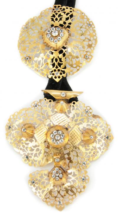 Normally the black spots in the middle of the rhinestones indicate that the culet (point) of the stones have been cut, indicating that the stones are old. I have recently discovered however that on some antique regional jewels the black spots have actually been painted on the points of the stones. These jewels were certainly made between 1870 and 1900 for the tourists who eagerly sought regional jewels, and especially the older ones.