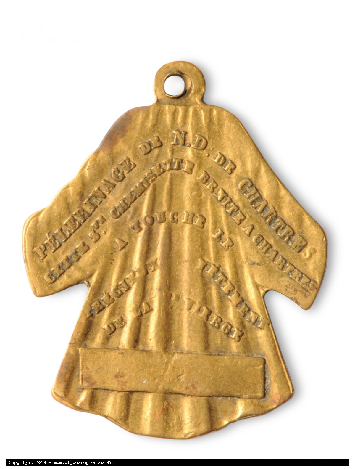 The cathedral of Chartres holds a much venerated relic purported to be the tunic worn by the Holy Mary. The many pilgrims to the Chartres cathedral, one of the largest and finest gothic cathedrals in the world, enjoy buying a souvenir of this relic, known as a “chemisette de Chartres”, (little tunic of Chartres.) or "chemisette Notre-Dame" These souvenirs can be in the form of a simple brass or silver tunic-shaped medal and even silver reliquaries.