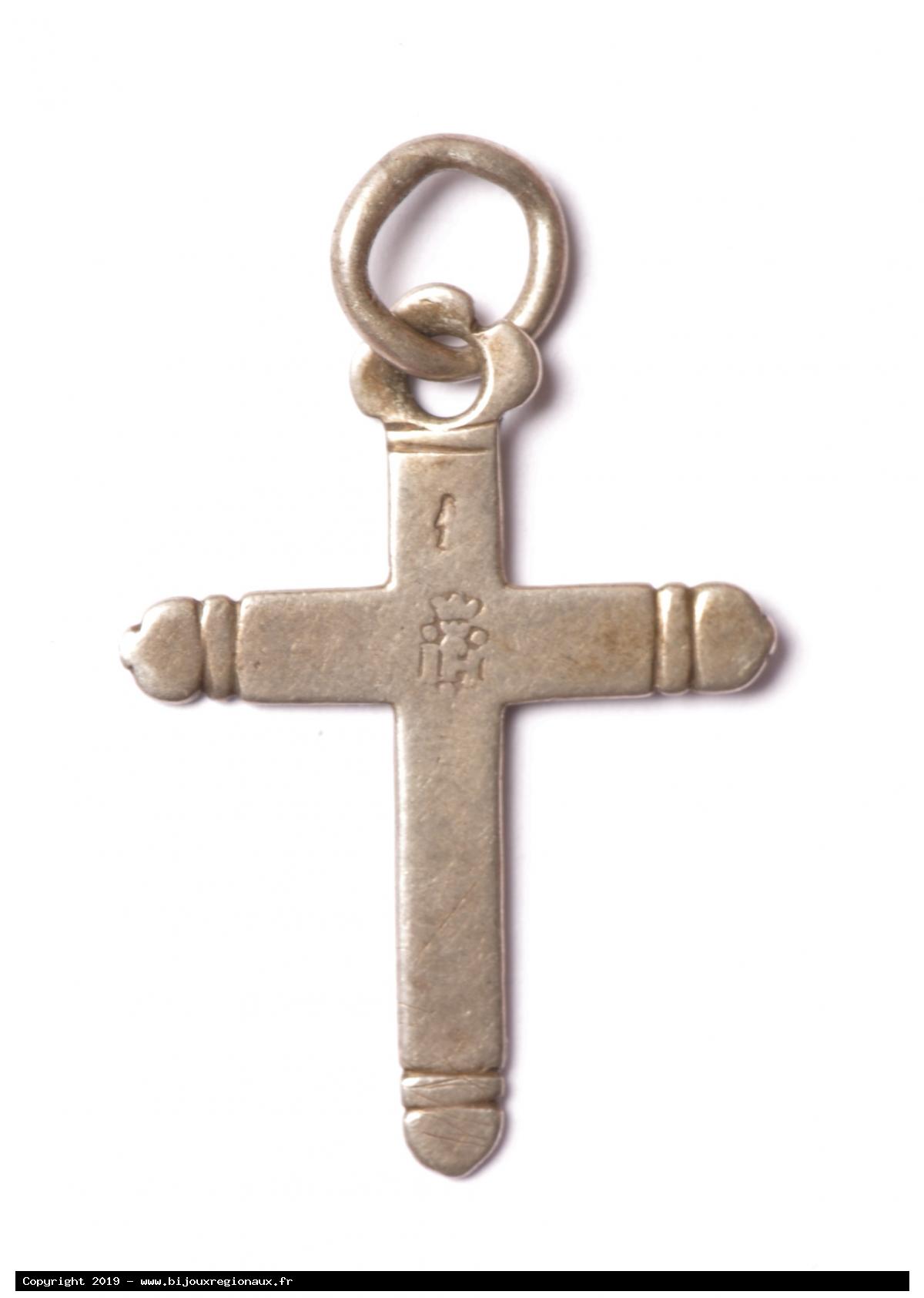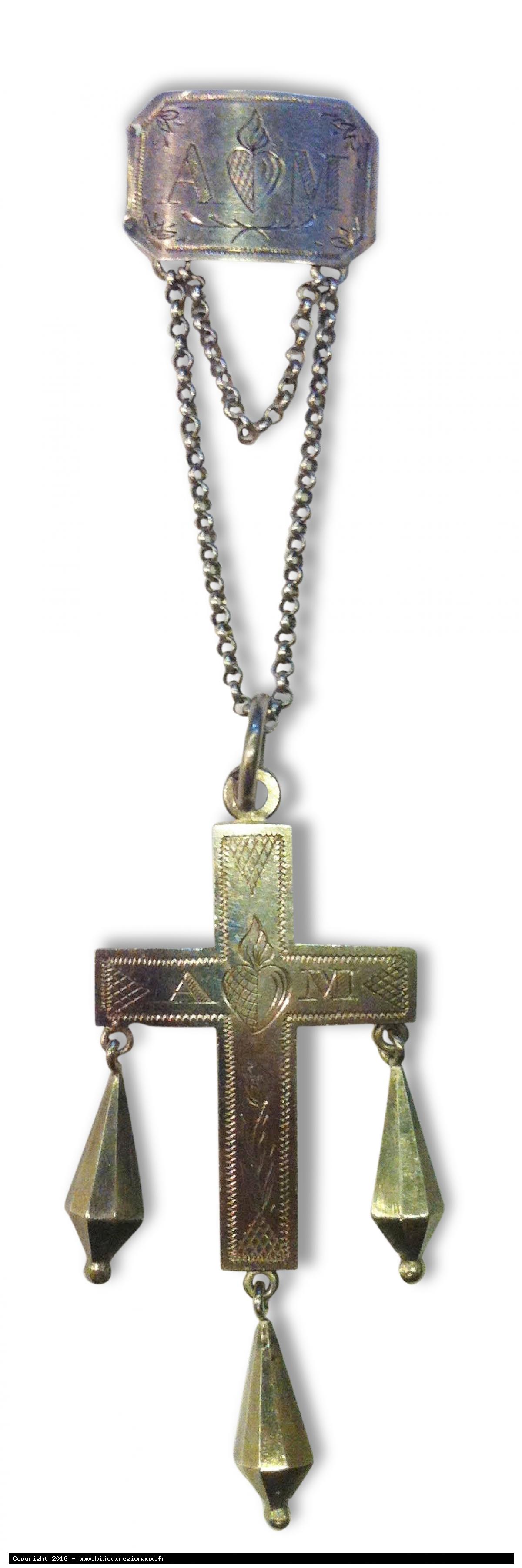 The Berry “jardinière” cross is a hollow Latin cross garnished with three pendants which are either sbaped like drops or like faceted nails with spheres at the tips. The top of the cross is equipped with a suspension ring attached to either a simple loop or a fleur-de-lys motif. The faces are engraved with various motifs such as a sun, flowers, animals, objects of the Passion of Christ and acronyms such as AM, MA, AV or MHA. The cross is often suspended by two chains from a rectangular slide with truncated corners fitted with two flanges on the rear and engraved with the letters AM separated by a burning heart on the front.