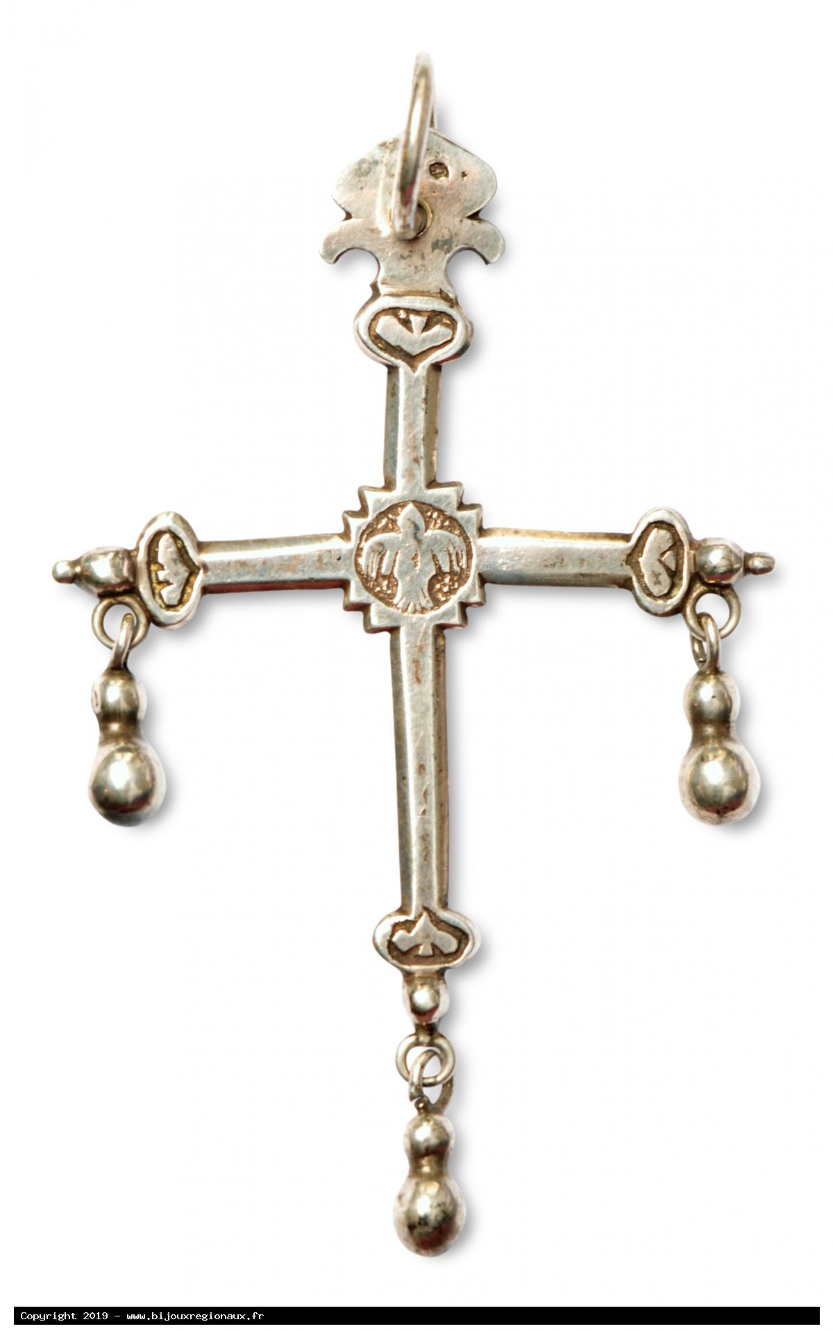 The Beaufortain cross is double sided and hollow with the arms being all almost the same length. One side is engraved with flowers and the INRI acronym, the other with rays. The cross is embellished with three pendants each made of two spheres soldered together. The heart-shaped slide has a border cut out with points.
