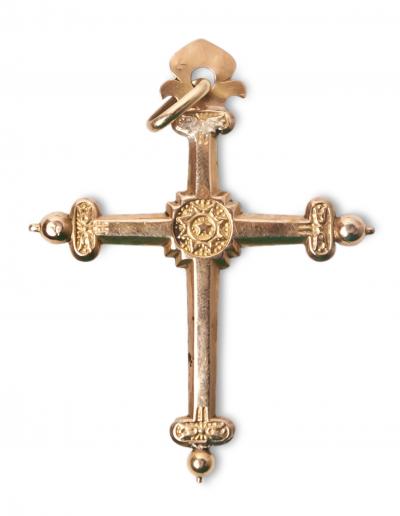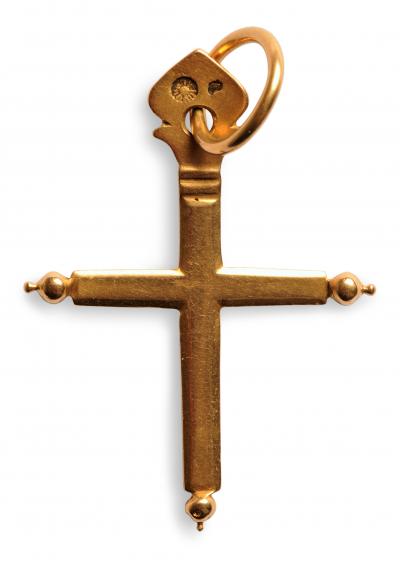 The Valloire cross has Christ on one side, Mary on the other and is distinguished by the rays emanating from the centre of the cross. The arms are tipped with a fleur-de-lys motif. On some crosses there are three groups of seven little spheres around Mary that are perhaps reminders of the stars on the cross of the Valloire church in Savoy. Popular in the Savoy region, the Valloire cross was produced and worn in Champagne, Paris and the east of France and appears to be found only in gold.