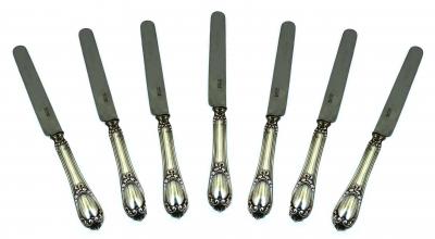 One sometimes sees sets of small knives with silver blades, these are fruit knives. Until the advent of stainless steel, the acid in fruits would quickly stain and rust the steel blades of knives. A silver blade, although too weak to cut a steak, is suficient to cut fruit and will not discolour. The old rule of etiquette whereby one tears salad leafs with one's fingers at the table rather than cutting them with a knife has its origins in the same phenomenon: the acidic vinegar would quickly attack the old steel blades. With stainless steel being widespread, this custom has no longer any reason to be followed UNLESS you are invited to a meal where antique knives will be used!