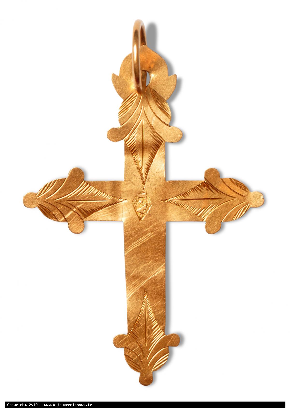 "Small flat crosses, of poor appearance, the arms terminating in rough clover-leaf designs (at Rozans, in the Hautes-Alpes) .This form is more pronounced at Orpierre, the ends are embellished by 2 or 3 incisions, at Saint Bonnet, and finally at Vallouise we see trefoil and slightly openworked ends. " (Paul Bisch, Some Notes on Dauphinois Jewels) (3) Most of these crosses have bevelled edges, however some are made of very thin gold sheet, cut out and engraved with triangles. It is not yet clear to me where these latter crosses, illustrated below, were worn.